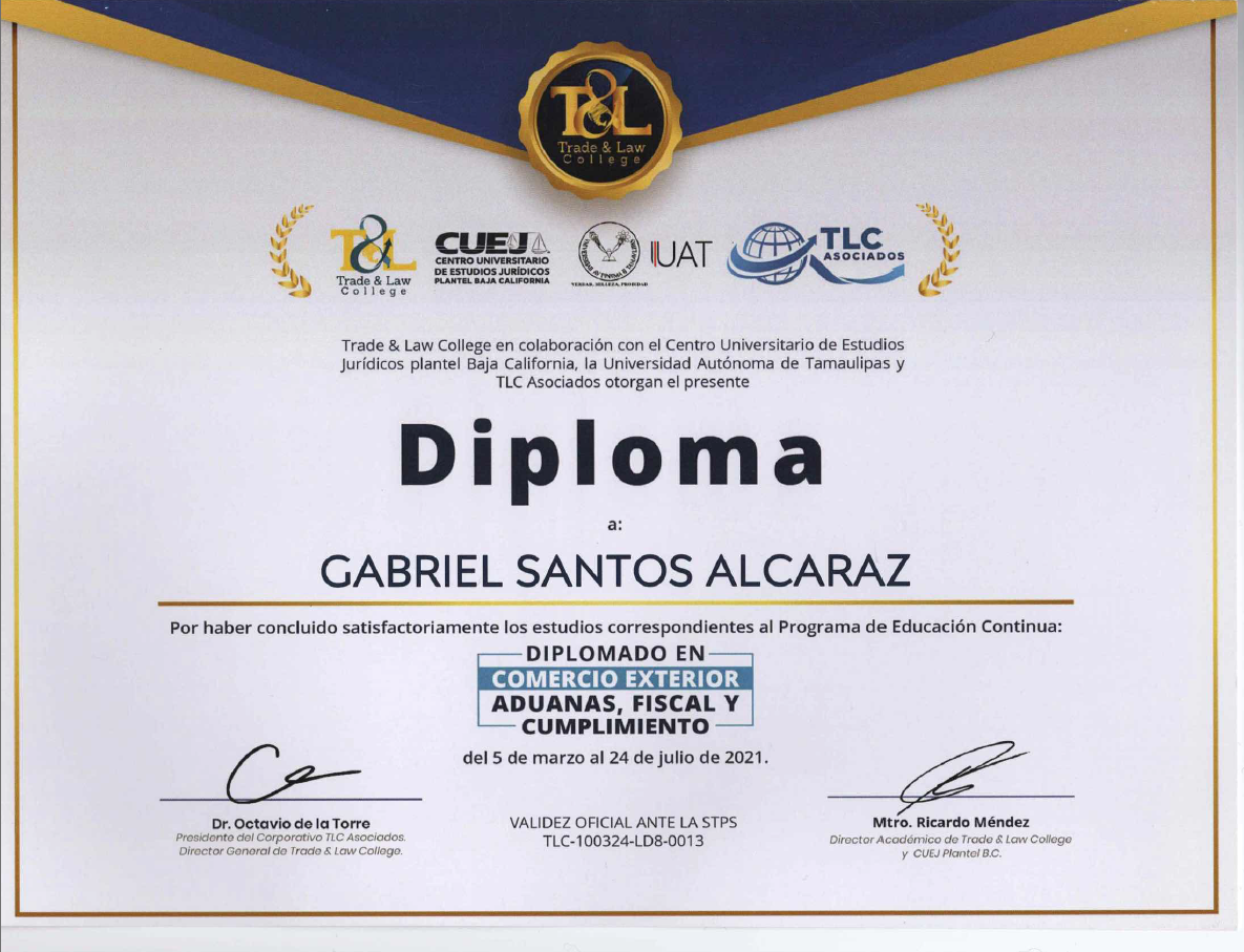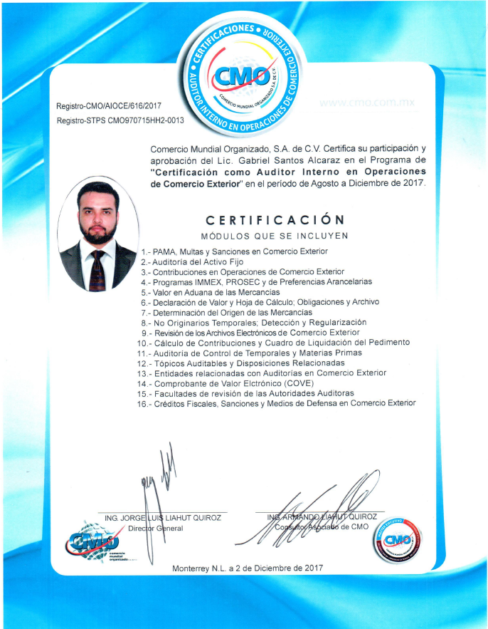 Gabriel Santos Alcaraz, fundador y consultor Senior en GSB Trade Solutions. Con amplia experiencia en comercio exterior, especialista en empresas IMMEX, cumplimiento aduanero y gestión de proyectos estratégicos, ha colaborado con empresas internacionales de sectores como automotriz, manufactura, electrónica y servicios. Certificado como Auditor Interno en operaciones de comercio exterior por CMO, Registro: STPS CMO970715HH2-0013, Diplomado en Comercio exterior, aduanas, fiscal y cumplimiento, STPS TLC-100324-LD8-0013, Certificado como White, Yellow y Green Belt en Lean Six Sigma.